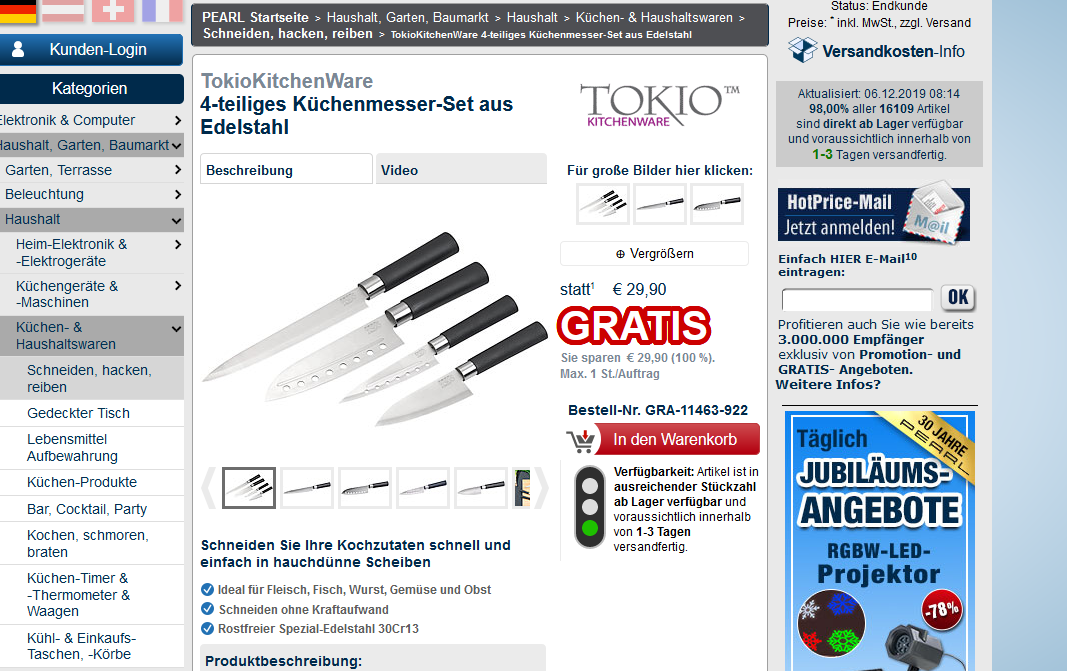 Top bei Pearl bekommt man derzeit das Tokio KitchenWare 4-teiliges Küchenmesser-Set aus Edelstahl Gratis statt UVP 29,90 Euro inkl.Versandkosten für 4,95 Euro
