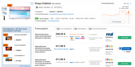 Bei real bekommt man derzeit die Philips 4K Ultra HD LED 126cm (50 Zoll) 50PUS6554 UHD Smart TV, Triple Tuner für 368,95 Euro inkl.Versand(PVG ab 412,00)