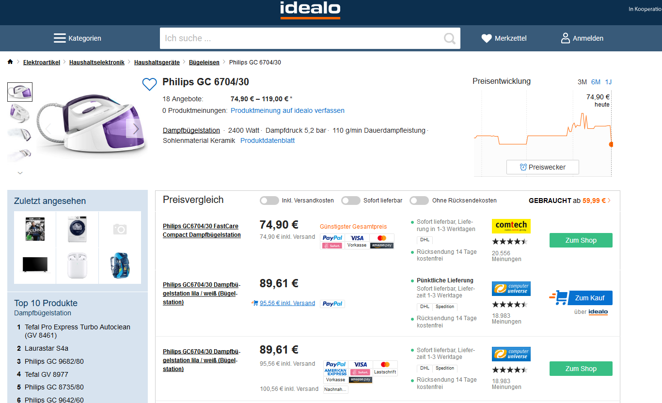 Bei comtech bekommt ihr den Philips GC 6704/30 – Dampfbügelstation mit 5,2 bar Druck, 1,3 Liter und Keramiksohle für 74,90 statt PVG ab 89,84 Euro Versandkostenfrei.