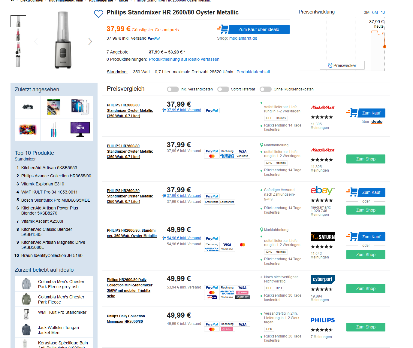 Bei Mediamarkt bekommt man derzeit die PHILIPS HR2600/80 Standmixer Oyster Metallic (350 Watt, 0.7 l) für 37,99 bzw. 32,29 Euro Versandkostenfrei wenn ihr Club-Mitglied seid! (PVG ab 49,99 Euro)