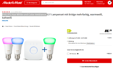 Bei Mediamarkt bekommt man die PHILIPS Hue White und Color Ambiance E27 Lampenset mit Bridge mehrfarbig, warmweiß, kaltweiß für 88,99 statt PVG ab 129 Euro Versandfrei