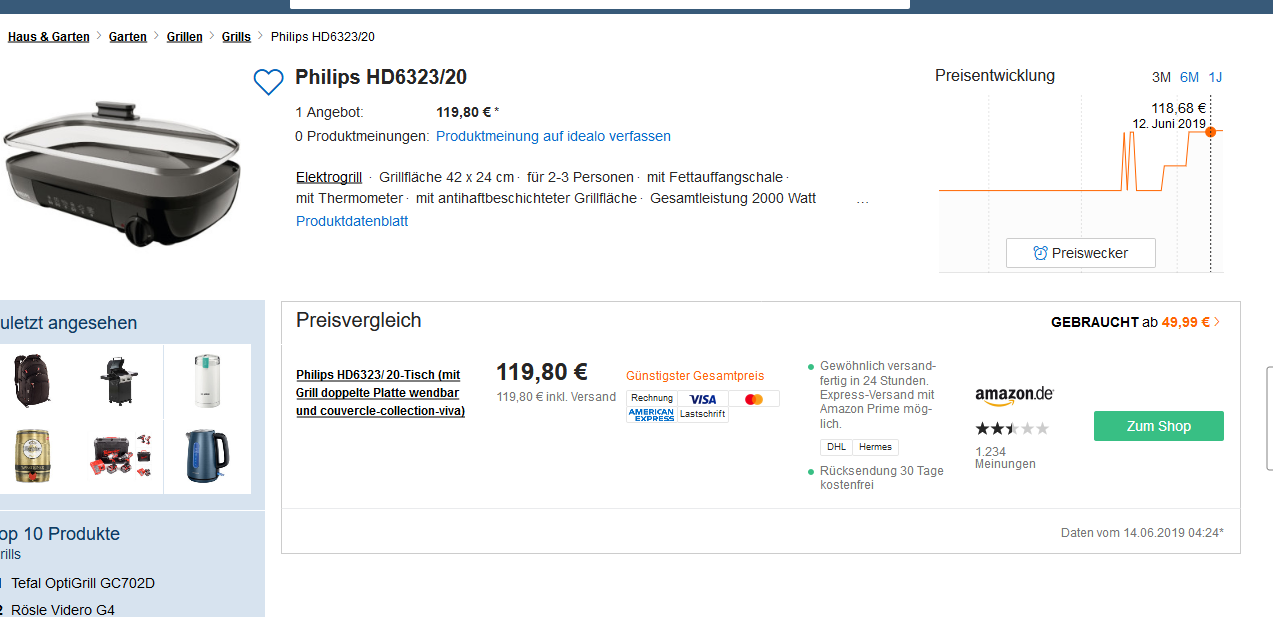 Bei ibood als Tagesangebot den Philips Tischgrill HD6323/20, 2000 W für 55,90 statt PVG ab 119,90 Euro inkl.Versand