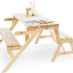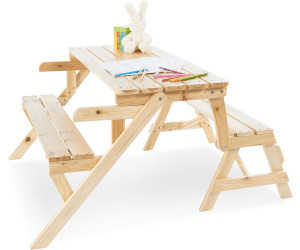 Vollmassiv: Fichte, unbehandelt Mit einer einfachen Handbewegung von Kindersitzgarnitur (2 Bänke mit 1 Tisch) zur Gartenbank umbaubar Kindersitzgarnitur: L 98 cm, B 115 cm, H 58 cm Gartenbank: B 98 cm, T 60 cm, H 69 cm Sitzhöhe 35 cm Empfohlen für Kinder von 3 bis 8 Jahren