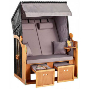 Der Strandkorb „Ostsee“ ist aus Korbgeflecht in schwarz/braun gehalten mit uni lichtgrauem Bezug.