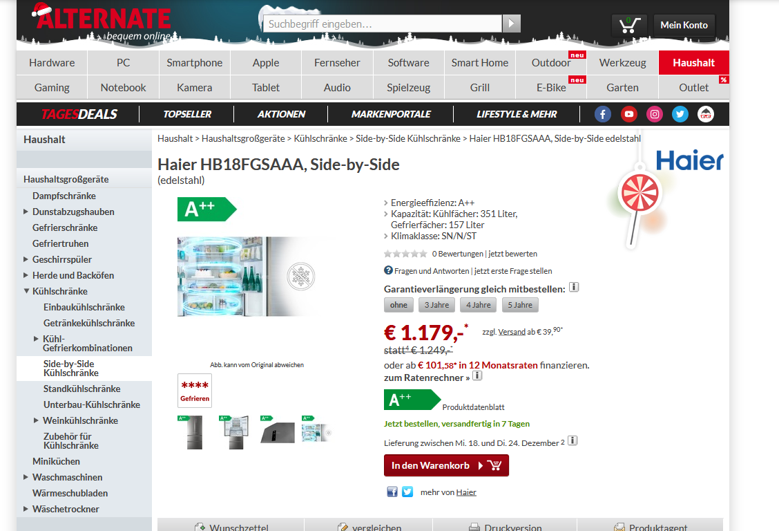 kurz und knapp bei Alternate gibt es ein Haier HB18FGSAAA, Side-by-Side Kühlschrank für 469 €