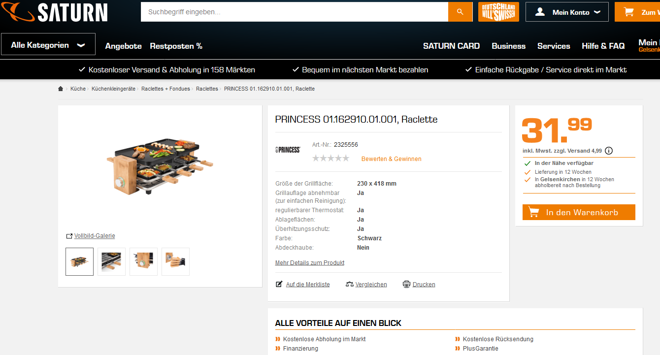 Bei Mediamarkt erhaltet man derzeit die PRINCESS 01.162910.01.001 Raclette für 31,99 Abholpreis statt PVG ab 57 Euro. (Lieferung in 6 Wochen + 4,99 Euro)