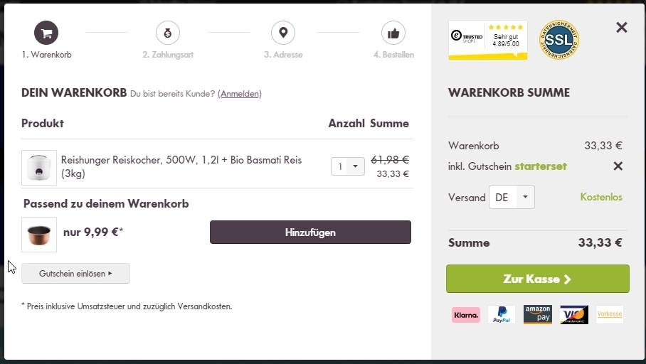 Um auf den Preis zu kommen müsst ihr direkt auf der Seite in den (leeren) Warenkorb und dort den Code „starterset“ eingeben. Würde man sich alles einzeln kaufen, kommt man ca. auf 52€: 40€ für den Reiskocher + 12€ für den Reis.