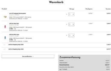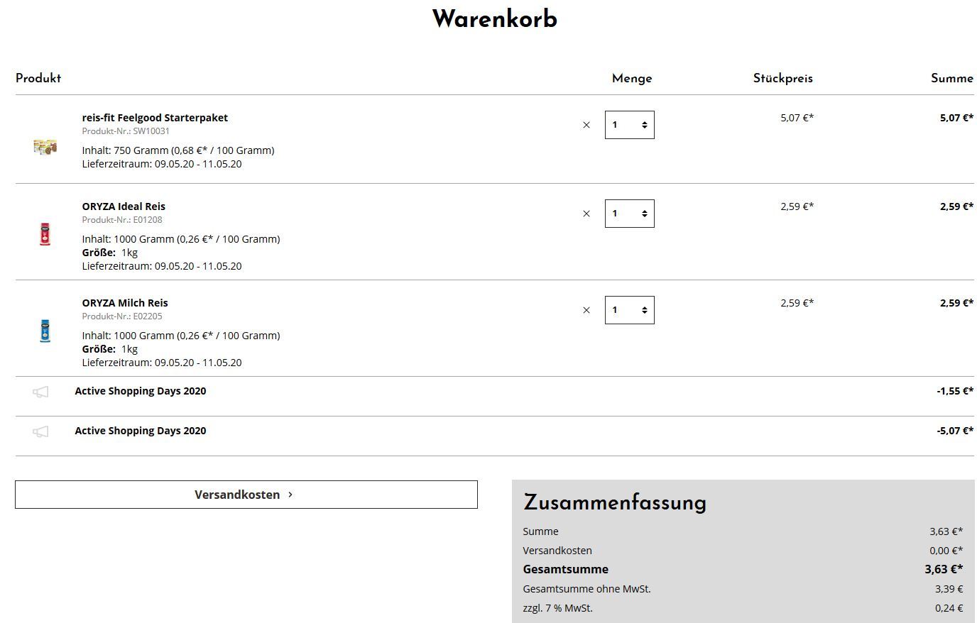 1. Hol Dir die Mai-Ausgabe von MEN’S HEALTH, WOMEN’S HEALTH oder RUNNER’S WORLD, darin findest Du den Aktionscode. Informationen rund um die Active Shopping Days findest Du hier: http://www.activeshoppingdays.de Während der Active Shopping Days erhältst du einmalig 30 % Rabatt auf das gesamte Sortiment in unserem Reiskontor und das Feelgood-Starterset gratis zu deiner Bestellung. Gib dazu bei deinem Einkauf das Feelgood-Starterset in deinen Warenkorb. Nach Eingabe des Aktionscodes werden Rabatt und Gratisset ausgewiesen.