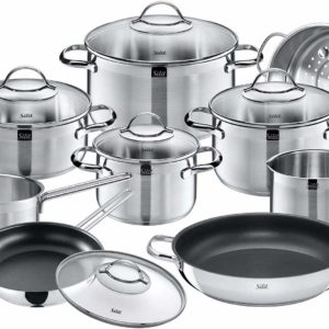 - Inhalt: 1x Bratentopf m. Deckel 20cm, 3x Fleischtopf m. Deckel 16,20,24cm, 1x Stielkasserolle 16cm, 1x Milchtopf 14cm, 1x Dämpfeinsatz 20 cm, 1x Pfanne 24cm, 1x Glasdeckel 24cm, 1x Servierpfanne 28cm