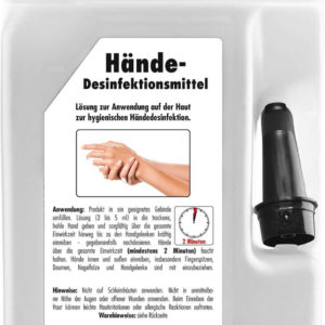 - Anwendung: Lösung (etwa 3 ml) in die trockene, hohle Hand geben – mindestens 30 Sekunden – bis zu den Handgelenken kräftig einreiben. Hände über die gesamte Einwirkzeit feucht halten – entsprechend nachdosieren. Hände innen und außen einreiben, insbesondere Fingerspitzen, Daumen, Nagelfalze und Handgelenke sind mit einzubeziehen.