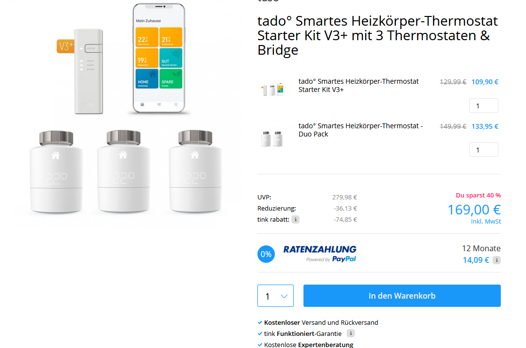 Bei Tink gibt es das Tado Heizkörper Set für 169€ mit drei Thermostate. Falls jemand mit dem Gedanken spielt sich damit aus zu rüsten finde ich persönlich den Preis ganz gut.