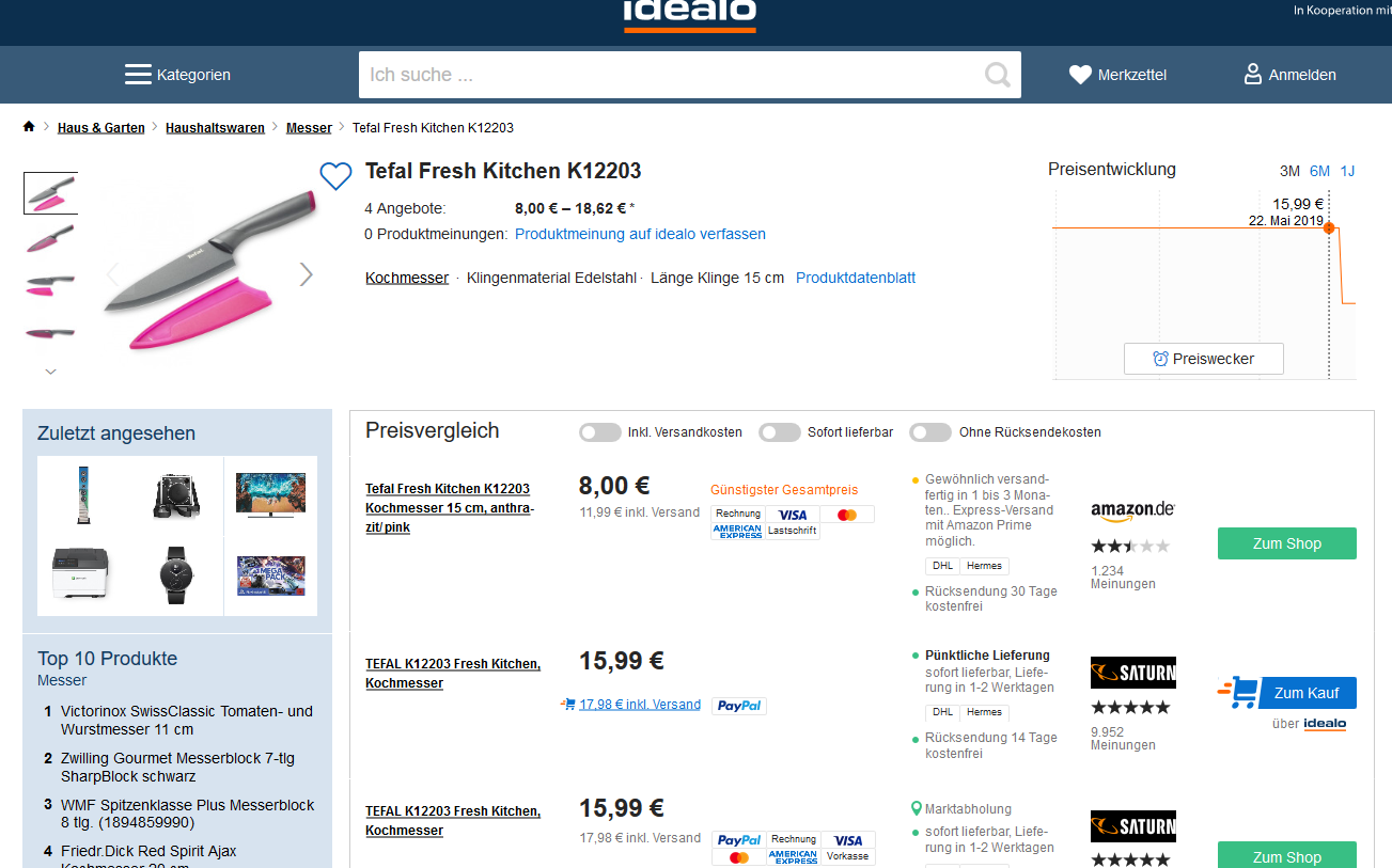 Bei Amazon bekommt ihr den Tefal Fresh Kitchen K12203 Kochmesser 15 cm, anthrazit/pink für 8,00 statt UVP 15,99 (PVG ab 17,98 Euro)Inkl.versand für Primekunden, sonst kommen + 3,99 Euro versandkosten hinzu.