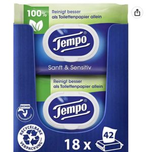 Tempo feuchtes Toilettenpapier sanftundsensitiv Trio-Pack (18 Packungen x je 42 Blatt) für 14,31€ inkl. Prime Versand.