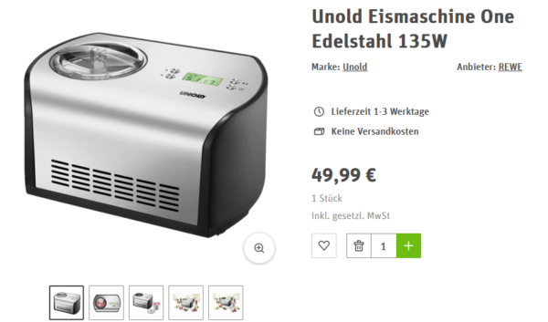 Es gibt die Unold Eismaschine One Edelstahl 135W bei rewe.de, es handelt sich bei dem Angebot um einen Preisfehler, als wer möche schnell zugreifen!