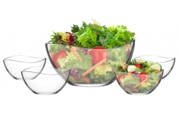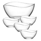 5-teiliges Schüssel-Set aus Glas in dekorativer geschwungener Form der Serie Malaga, ideal für Salate, Bowle, Desserts oder Snacks. Einfache Reinigung auch für die Spülmaschine geeignet.