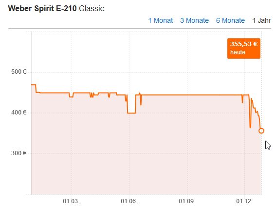 Für Neujahrsgriller und antizyklische Käufer gibt’s bei Amazon den Weber Spirit E-210 Classic Schwarz für 355,53€ (inkl Versand). Der PVG beginnt ab 443,95€ (inkl Versand).