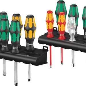 12-teiliges Schraubendreher Allround-Set. Kraftform Plus Griff für angenehm ergonomisches Arbeiten, bei dem Blasen und Schwielen vermieden werden. Harte Griffzonen für hohe Arbeitsgeschwindigkeit, während weiche Griffzonen hohe Drehmomentübertragung garantieren. Teilweise mit Lasertip: Die Spitze von Wera Lasertip-Schraubendrehern wird mit Laserstrahlen mikroskopisch fein aufgeraut. Diese raue Oberfläche „beißt“ sich förmlich im Schraubenkopf fest. Das unbeabsichtigte Herausrutschen gehört der Vergangenheit an.