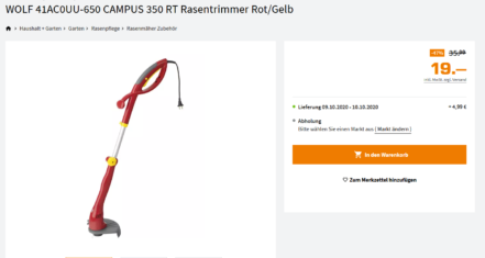 Tayfun 08.10.2020, 10:48 #Oder die WOLF 41AC0UU-650 CAMPUS 350 RT Rasentrimmer Rot/Gelb für 19€ bei abholung PVG ab 25€