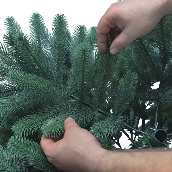 Diese kommt durch das hochwertige Spritzgussverfahren aus PE Kunststoff und die realistische Farbgebung der Nadeln zustande. Der künstliche Weihnachtsbaum besteht aus ca. 766 Zweigen und wirkt damit besonders kräftig und wuchsfreudig. Die Form seiner Zweige wurde von echten Bäumen abgenommen, um die Tanne besonders realitätsnah darzustellen. Des Weiteren ist auch die Färbung an die einer echten Tanne angelehnt. Die Zweige verlaufen von der Spitze bis nach hinten in ein immer dunkler werdendes Grün. Der Stamm der Zweige ist braun eingefärbt, was dem Aussehen eines natürlichen Baumstammes stark ähnelt. Der Weihnachtsbaum besteht aus 4 Steckmodulen, die sich einfach zusammenfügen lassen.