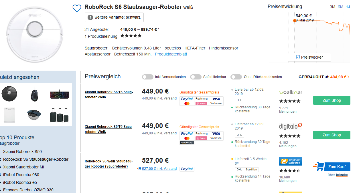 Xiaomi Roborock S6/T6 für 449 Euro PVG: 527 Euro