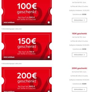 Gültig bei Neuaufträgen im Online Shop in der Kategorie Sofas & Couches. Die Gutscheincodes SC100, SC150 und SC200 können gestaffelt nach Mindestbestellwerten 500€, 750€ und 1000€ im Bestellvorgang eingelöst werden. Ausgenommen sind mit SALE – gekennzeichnete Artikel und Produkte der Marken Livetastic, MID.YOU, P&B, Rolf Benz, Joop!, Stressless, Erpo, Musterring, Kare und SetOne by Musterring. Keine weiteren Konditionen möglich. Keine Barauszahlung. Basispreis ist Grundlage für alle Abschläge. Mindestens gültig bis 16.05.2021.
