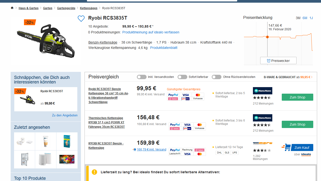 Zum Bestpreis bekommt man bei manomano.de die Ryobi RCS3835T Benzin Kettensäge 38 cm³ 35 cm Anti-Vibrationshandgriff Schwertlänge für 99,95 statt PVG ab 166,79 Euro Versandfrei.