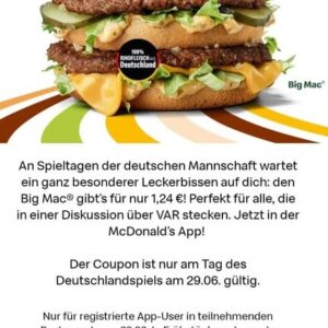 Nachdem es bei Mc Donald´s zum letzten Spiel der deutschen Nationalmannschaft 2 Big Mac zum Preis von einem gegeben hat gibt es am kommenden Spieltag am Samstag, 29.06.2024, den Big Mac für 1,24 €.