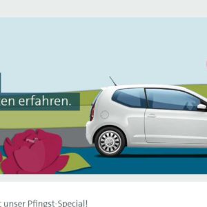Auch zu Pfingsten gibt es wieder günstige Tarife bei Rent-a-Car. Zwischen 7.6. und 17.6.2019 kann man günstig bei allen teilnehmenden Stationen Fahrzeuge mieten. Ein VW Up ab 38,90 und einen Passat ab 69,90, die maximale Mietdauer ist 10 Tage. Wer also einen Ausflug zu Pfingsten plant oder Verwandte besuchen will und einen fahrbaren Untersatz sucht kann hier fündig werden.