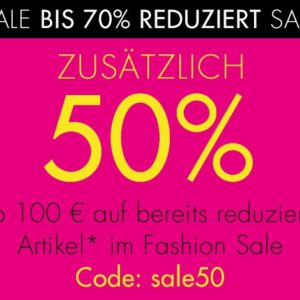 Denn es gibt satte 50% Rabatt ab 100 € Einkaufswert auf bereits reduzierte Artikel.