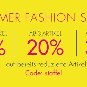 Bis zum 13.07.2021 10 % ab einem reduzierten Artikel, 20 % ab 3 reduzierten Artikeln und 30 % ab 5 reduzierten Artikeln aus den Bereichen Damen-, Herren-, Kinder- und Sportbekleidung, Schuhe, Strümpfe, Taschen, Koffer und Accessoires sichern. Einfach im Warenkorb den Aktionscode staffel eingeben und der Nachlass wird abgezogen. Gültig auf GALERIA.de für Produkte ausgewiesen mit „Verkauf und Versand durch GALERIA“. Nicht nachträglich für bereits gekaufte Ware und nicht in Verbindung mit anderen Rabattaktionen und Aktionscodes einsetzbar. Kein Nachlass auf nicht reduzierte Ware, Wäsche, Schulranzen, Schulrucksäcke, DFB-Artikel und folgende Marken: galeria.de/prozent-ausschluss