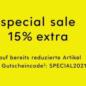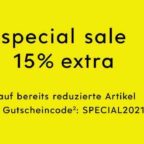„Sichern Sie sich nur noch heute bis Mitternacht Ihren zusätzlichen 15% Preisvorteil auf bereits reduzierte Artikel! Geben Sie einfach folgenden Code* im letzten Schritt des Bestellvorgangs ein: SPECIAL2021„