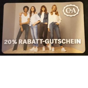 PS: Dürfte vor allem auch für alle relevant sein, die bei der Penny-Aktion (20% auf C&A-Karten) zugeschlagen haben! Wer damals die 100€-Karte für 80€ gekauft hat, kann dann sogar für 125€ shoppen!