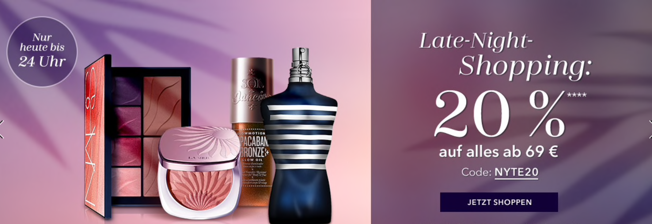 Bei Douglas erhaltet ihr nur heute Abend 20% Rabatt auf euren Einkauf nicht reduzierter Artikel ab 69€. Nutzt dazu einfach den Gutscheincode NYTE20.