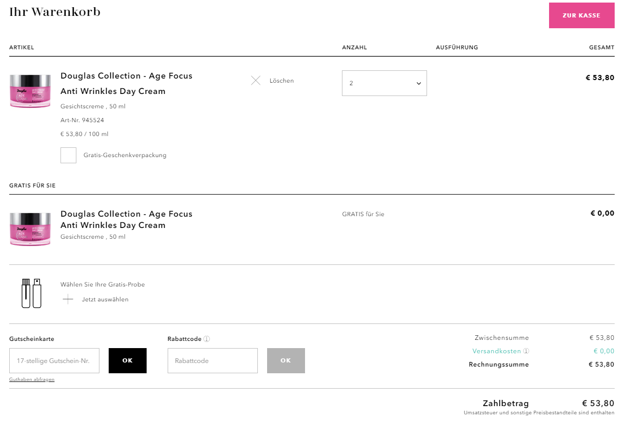 Ich habe es eben mit dem „DOUGLAS COLLECTION Age Focus Anti Wrinkles Day Cream“ für 26,90€ und gleich 3 Stück davon im Warenkorb hinzugefügt. Nach Eingabe des Gutscheincodes wurde mir ein Produkt komplett gutgeschrieben, und so würde ich 53,80€ statt 80,70€ zahlen.