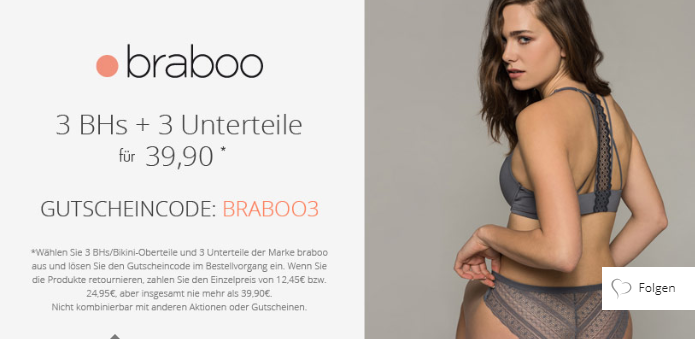 lemalix 29.03.2019, 15:09 #3 BHs + 3 Unterteile der Marke braboo für 39,90€ mit dem Gutscheincode: BRABOO3