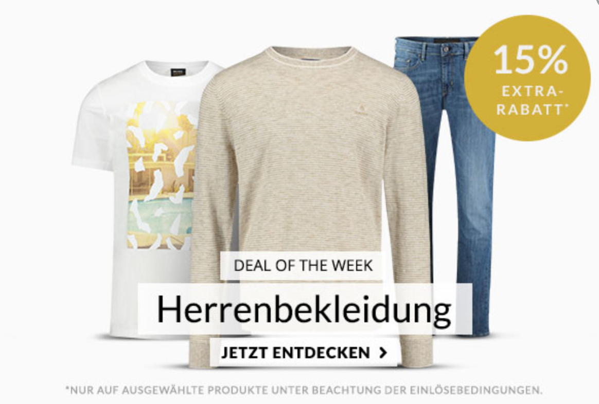 Matthi 18.05.2019, 08:04 # hilfreichNun sind die Herren an der Reihe und bekommen 15% Extra-Rabatt auf Bekleidung: https://www.engelhorn.de/suche?pmid=190518_WeeklyDeal_F_Herrenbekleidung&cgid=fashion-shop