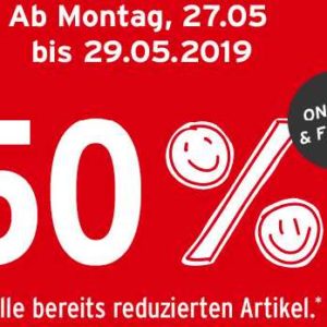 Ab 27.05 bis 29.05. bekommt ihr im Onlineshop und in den Filialen 50% Rabatt auf über 700 bereits reduzierten Artikel.
