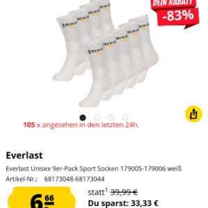 Bei SportSpar bekommt den Everlast Unisex 9er-Pack Sport Socken für 10,61€ inklusive Versand. Den besten Vergleichspreis gibt es bei eBay. Dort kosten die Socken 12,12€ inklusive Versand. Die Socken gibt es in den Universal-Größen 39-42 und 43-46 in der Farbe Weiß. Hier ist noch der Link zum Vergleichspreis bei eBay: https://www.ebay.de/itm/202980839292