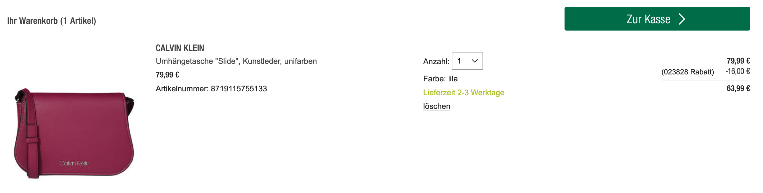 Habe mal "wunschgemäß" nach einem Beispiel gesucht: Ihr erhaltet beispielsweise die CALVIN KLEIN, Umhängetasche "Slide" für 63,90€.