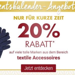 Im Online-Shop von Galeria-Kaufhof verstecken sich hinter dem 21. Türchen im Adventskalender 20% Rabatt auf viele tolle Marken aus dem Bereich textile Accessoires. Ein Gutscheincode wird nicht benötigt, die Preise wurden bereits reduziert.