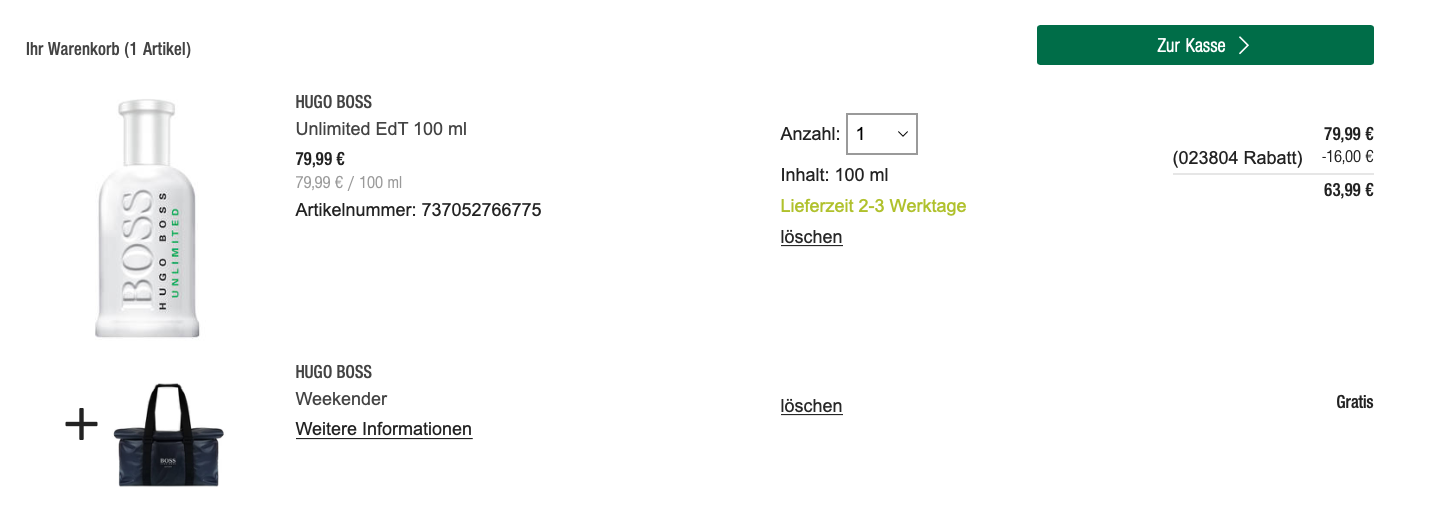 Im Online-Shop von Galeria-Kaufhof bekommt ihr beim Kauf eines Boss Bottled Herrenduftes ab 100 ml eine sportliche BOSS Parfum Weekender Tasche gratis dazu. Ein Gutscheincode wird nicht benötigt, die Zugabe wird automatisch dem Warenkorb hinzugefügt.