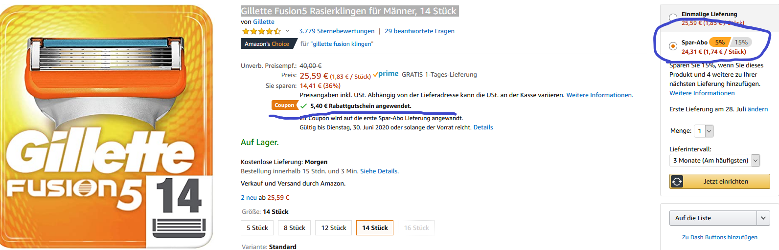 Auf Amazon bekommt man derzeit (im Kombi Coupon 5,40 € + bei meinen fall 5%) Sparabo Gillette Fusion5 Rasierklingen für Männer, 14 Stück für 18,91€ statt 25,59€ inkl.Versand mit Prime