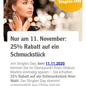 Globus Single Day am 11.11.20 – 25% Rabatt auf ein Schmuckstück im Glanzpunkt – zusätzlich vom 9.11.20 bis 11.11.20 einmalig 25% Rabatt auf Nonfood durch Prospekt Gutschein