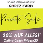 Einmalig gültig bis zum 19.07.2020 im Online-Shop sowie in allen Görtz, Görtz 17 und Hess Filialen in Deutschland. Outlet-Filialen sind ausgeschlossen. Gilt für das gesamte Sortiment, inkl. reduzierter Ware. Gilt nicht für bereits gekaufte Artikel oder den Kauf von Geschenkkarten. Ist nicht mit anderen Aktionen oder Gutscheinen kombinierbar. Einlösbar mit allen persönlichen GÖRTZ CARD Treuegutscheinen. Folgende Marken sind von der Aktion ausgeschlossen: Birkenstock, Dr. Martens, ECCO, Lloyd, Marc O’Polo, TOSH und Vagabond.