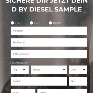 Hier erhaltet ihr eine gratis Probe Diesel Parfüm , das D by Diesel ;~} Teilnahmeschluss ist der 31.08.2022. Das Produktsampling endet außerdem, wenn 50.000 Produktsamples verteilt wurden, je nachdem, welches Ereignis früher eintritt.