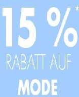Heute erhalten Sie 15% Rabatt auf Mode. Geben Sie im Warenkorb den Aktionscode mode15 ein und der Rabatt wird abgezogen. Nicht nachträglich für bereits gekaufte Ware und nicht in Verbindung mit anderen Aktionsvorteilen einsetzbar. Gültig bei karstadt.de für Produkte ausgewiesen mit „verkauft durch Karstadt“. Nicht gültig für Aktionsware.