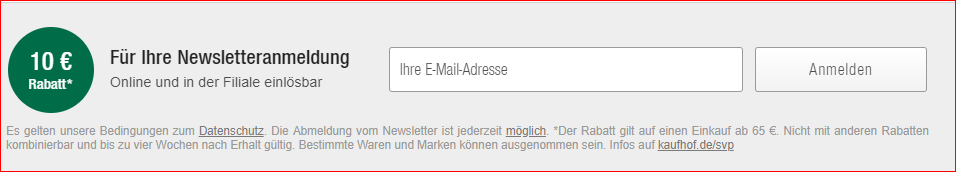 lemalix 09.04.2019, 22:20 #Der 10€ Gutschein, den man bei Newsletter Anmeldung bekommt, gilt auf einem Einkauf ab 65 €.