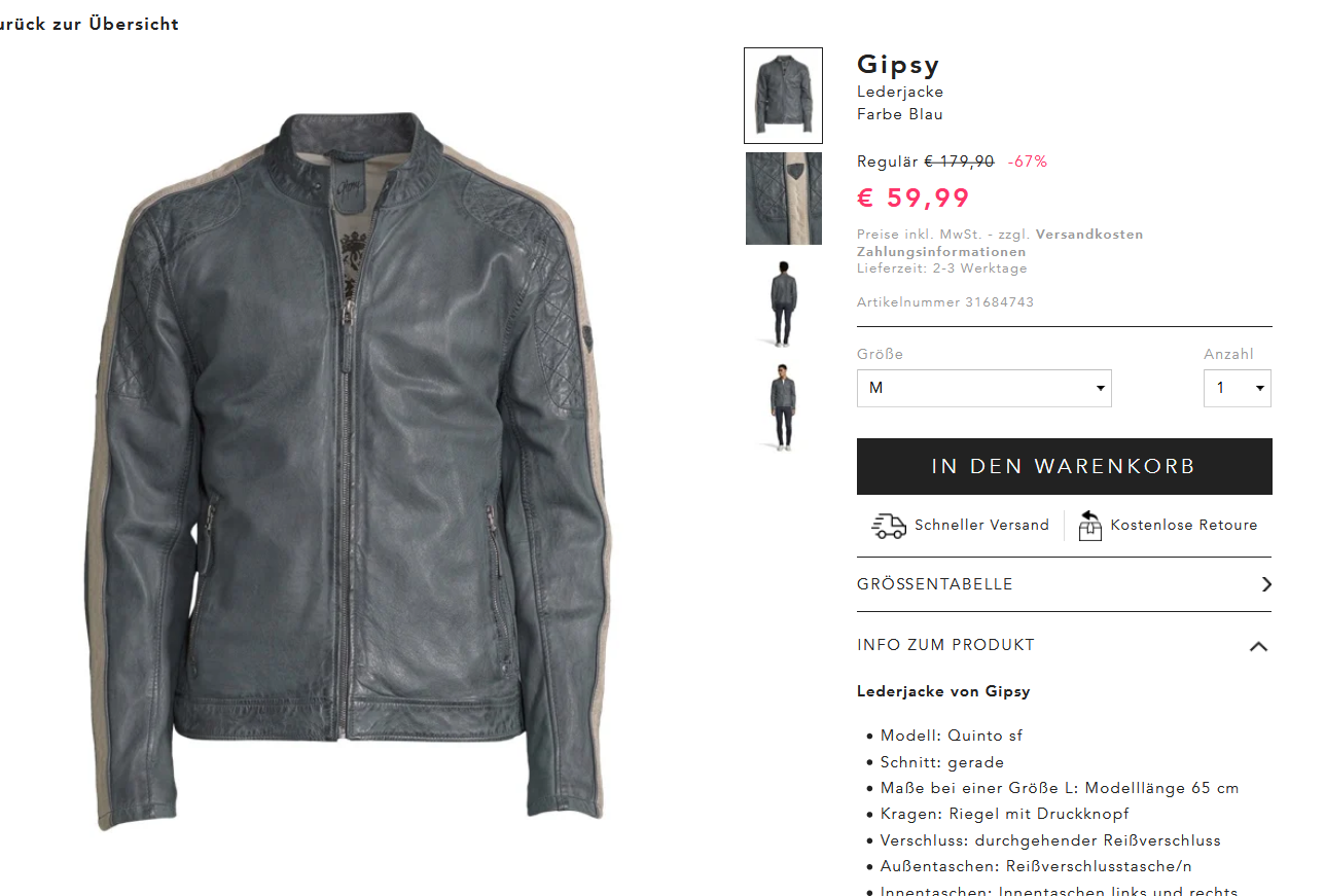 Ein Beispiel man bekommt die Lederjacke von Gr.S – XXXL GIPSY für 67,99 Euro UVP 199,00 Euro inkl.Versand