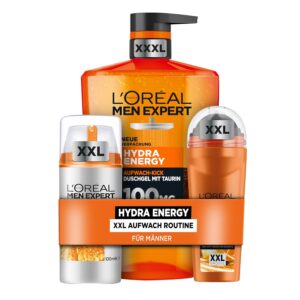 - Lieferumfang: 1x L’Oréal Paris Men Expert Hydra Energy 24h Anti-Müdigkeit Feuchtigkeitspflege, Inhalt: 100 ml, 1x Hydra Energy Duschgel und Shampoo für Herren, Inhalt: 1000 ml & Deo Roll-on Heat Protect 48H XXL, 5in1, 1 x 100 ml
