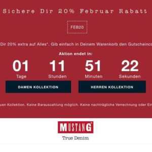 Bei Mustang bekommt ihr gerade 20% Rabatt auf fast alles im Shop! Ausgenommen sind Artikel der neuen Kollektion. Also auch auf Sale Artikel!
